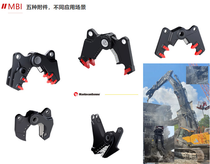 MS系列是曼托瓦尼產品家族中最通用的屬具,模塊化附件的設計,可以讓一臺機子適用于多種破拆場景,快速適應不同的需求。 MS+CC 用于拆除重型鋼筋混凝土結構 MS+CR破碎 用于混凝土結構的初次破拆 MS+CR粉碎 用于二次破拆和鋼筋分離 MS+SH 用于金屬結構破拆和廢料處理 MS+PSH 用于罐體等薄壁柱狀體破拆 PrevNext