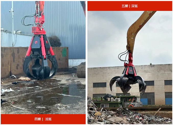 ·大塊/不規則(如廢鋼、石塊)→ 優先考慮瓣數少(3-4瓣)、淺弧、鈍尖的抓斗。